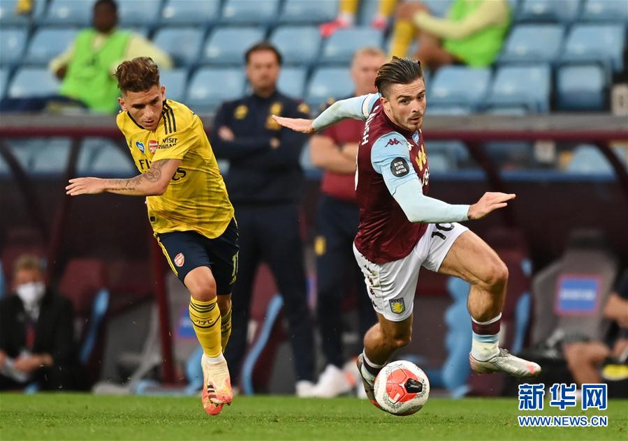 7月21日,阿斯顿维拉队球员格拉利什(右)与阿森纳队球员托雷拉在比赛中拼抢。 当日,在2019-2020赛季英格兰足球超级联赛第37轮比赛中,阿斯顿维拉队主场以1比0战胜阿森纳队。 新华社/路透