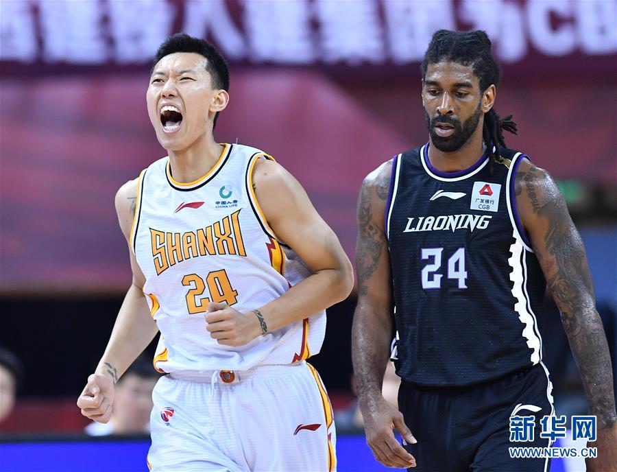 7月22日,山西汾酒股份队球员张泽龙(左)在比赛中庆祝得分。 当日,在山东青岛举行的2019-2020赛季中国男子篮球职业联赛(CBA)复赛第二阶段(红岛赛区)比赛中,辽宁本钢队以108比105战胜山西汾酒股份队。 新华社记者朱峥摄