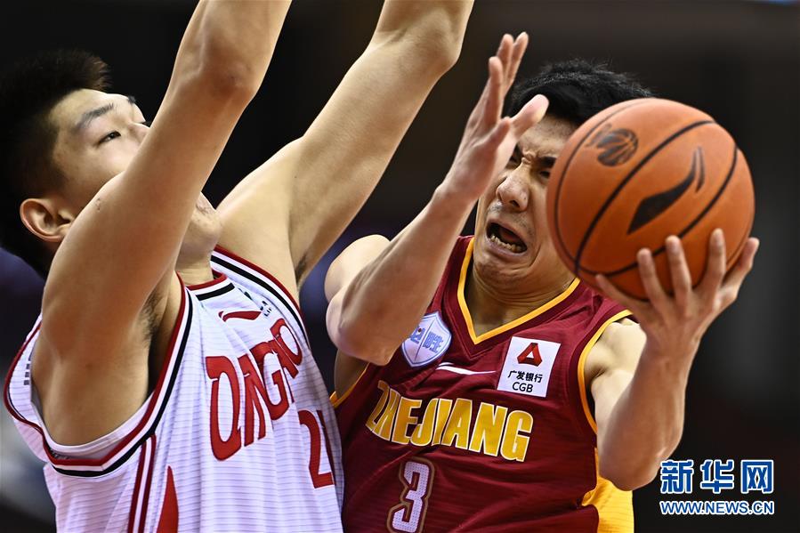 7月22日,浙江稠州银行队球员付磊(右)在比赛中突破上篮。 当日,在山东青岛举行的2019-2020赛季中国男子篮球职业联赛(CBA)复赛第二阶段(崂山赛区)比赛中,浙江稠州银行队以102比85战胜青岛国信双星队。 新华社记者郭绪雷摄