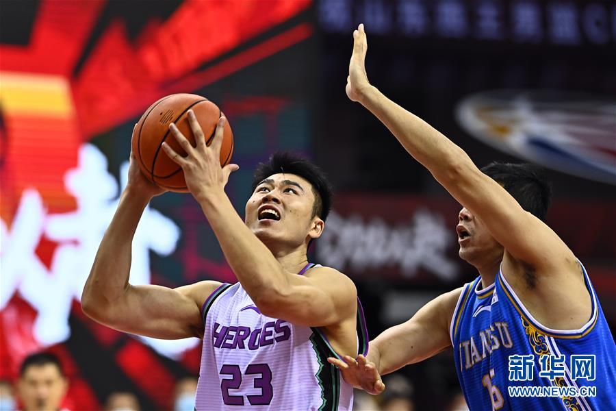 7月22日,山东西王队球员贾诚(左)在比赛中上篮。 当日,在山东青岛举行的2019-2020赛季中国男子篮球职业联赛(CBA)复赛第二阶段(崂山赛区)比赛中,山东西王队迎战苏州肯帝亚队。 新华社记者郭绪雷摄