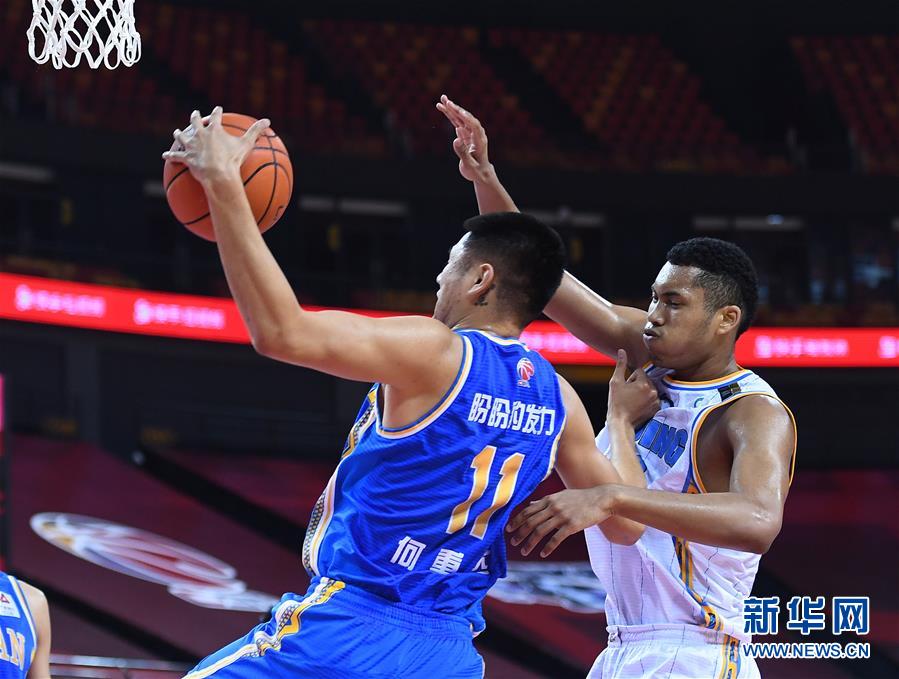 7月22日,北京首钢队球员加尼尤(右)与福建豹发力队球员何重达在比赛中争球。 当日,在山东青岛举行的2019-2020赛季中国男子篮球职业联赛(CBA)复赛第二阶段(红岛赛区)比赛中,北京首钢队对阵福建豹发力队。 新华社记者朱峥摄
