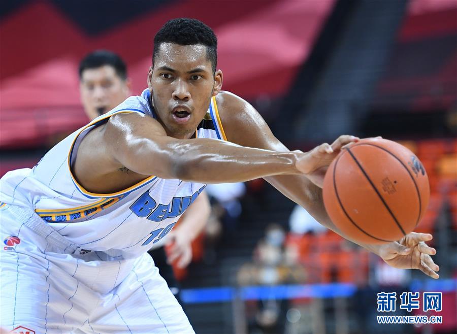 7月22日,北京首钢队球员加尼尤在比赛中传球。 当日,在山东青岛举行的2019-2020赛季中国男子篮球职业联赛(CBA)复赛第二阶段(红岛赛区)比赛中,北京首钢队对阵福建豹发力队。 新华社记者朱峥摄