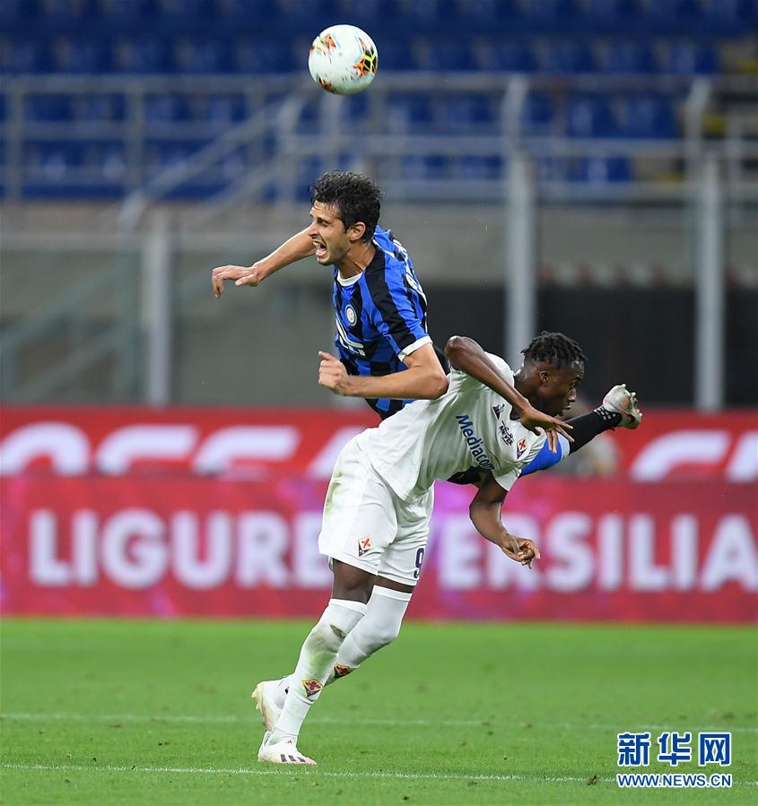 7月22日,国际米兰队球员拉诺基亚(上)与佛罗伦萨队球员夸梅在比赛中争顶。 当日,在2019-2020赛季意大利足球甲级联赛第35轮比赛中,国际米兰队主场以0比0战平佛罗伦萨队。 新华社发(阿尔贝托·林格利亚 摄)