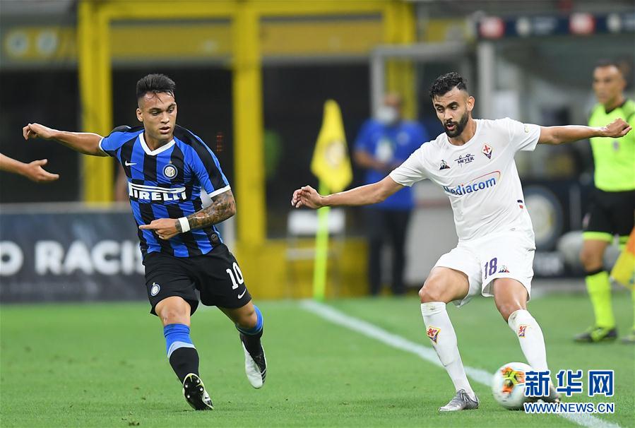 7月22日,国际米兰队球员马丁内斯(左)与佛罗伦萨队球员加扎尔在比赛中拼抢。 当日,在2019-2020赛季意大利足球甲级联赛第35轮比赛中,国际米兰队主场以0比0战平佛罗伦萨队。 新华社发(阿尔贝托·林格利亚 摄)