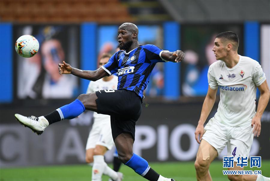 7月22日,国际米兰队球员卢卡库(左)在比赛中控球。 当日,在2019-2020赛季意大利足球甲级联赛第35轮比赛中,国际米兰队主场以0比0战平佛罗伦萨队。 新华社发(阿尔贝托·林格利亚 摄)