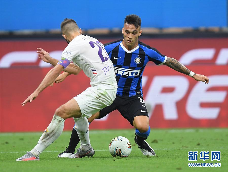 7月22日,国际米兰队球员马丁内斯(右)与佛罗伦萨队球员佩泽拉在比赛中拼抢。 当日,在2019-2020赛季意大利足球甲级联赛第35轮比赛中,国际米兰队主场以0比0战平佛罗伦萨队。 新华社发(阿尔贝托·林格利亚 摄)