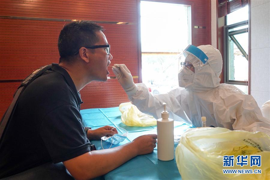 7月23日,医务人员(右)为一名媒体记者采集咽拭子。 当日,即将在江苏省苏州市采访2020中国足球超级联赛的媒体记者接受核酸检测。受新冠疫情影响,原定于2月22日开始新赛季的中超联赛将于7月25日正式开赛。 新华社记者李博摄