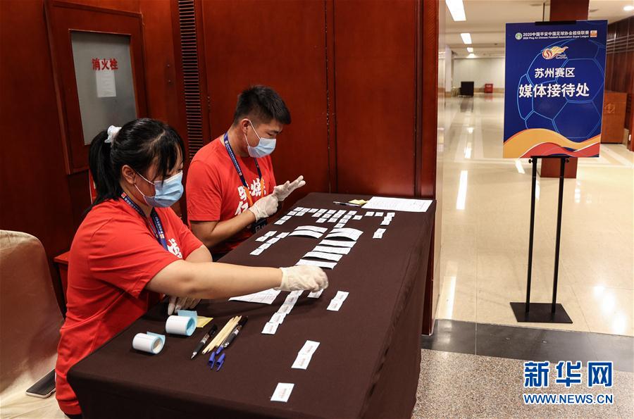 7月23日,两名志愿者在摆放媒体记者核酸检测所需的标签。 当日,即将在江苏省苏州市采访2020中国足球超级联赛的媒体记者接受核酸检测。受新冠疫情影响,原定于2月22日开始新赛季的中超联赛将于7月25日正式开赛。 新华社记者杨磊摄