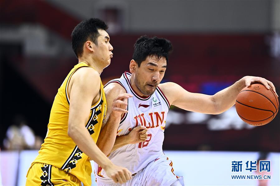 7月23日,吉林九台农商行银队球员钟诚(右)在比赛中带球进攻。 当日,在山东青岛举行的2019-2020赛季中国男子篮球职业联赛(CBA)复赛第二阶段(崂山赛区)比赛中,吉林九台农商银行队迎战浙江广厦控股队。 新华社记者郭绪雷摄