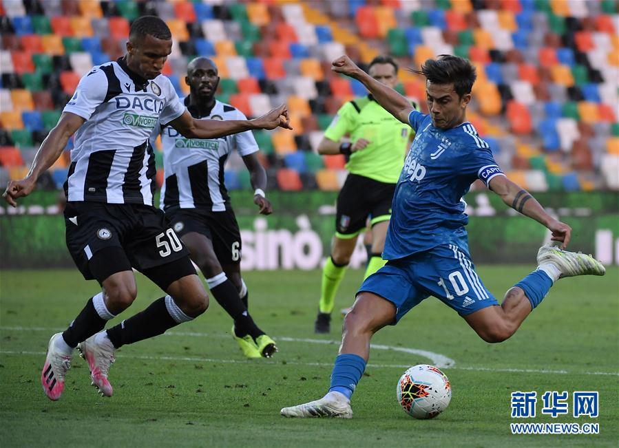7月23日,尤文图斯队球员迪巴拉(右)在乌迪内斯队球员贝康(左)的防守下进攻。 当日,在2019-2020赛季意大利足球甲级联赛第35轮的比赛中,乌迪内斯队主场以2比1战胜尤文图斯队。 新华社发
