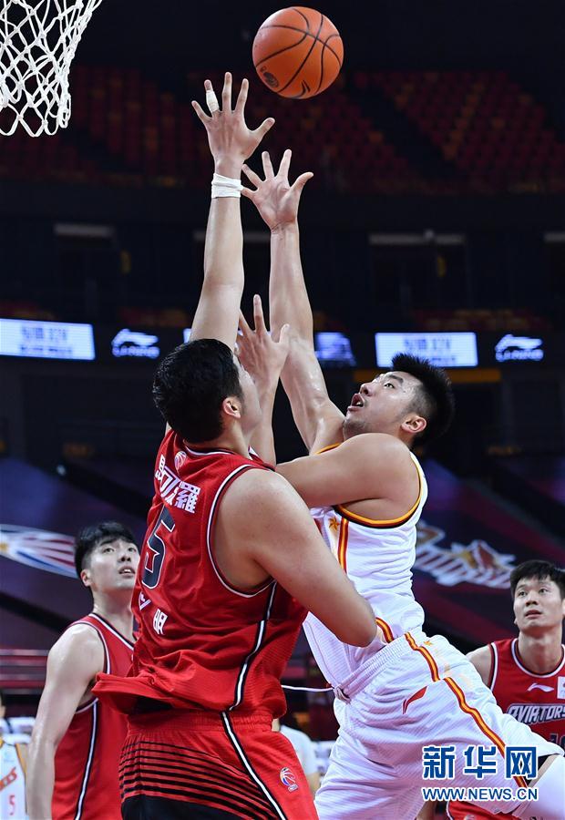 7月24日,八一南昌队球员邹雨宸(上右)在比赛中突破上篮。 当日,在山东青岛举行的2019-2020赛季中国男子篮球职业联赛(CBA)复赛第二阶段(红岛赛区)比赛中,八一南昌队以106比91战胜深圳马可波罗队。 新华社记者 朱峥 摄