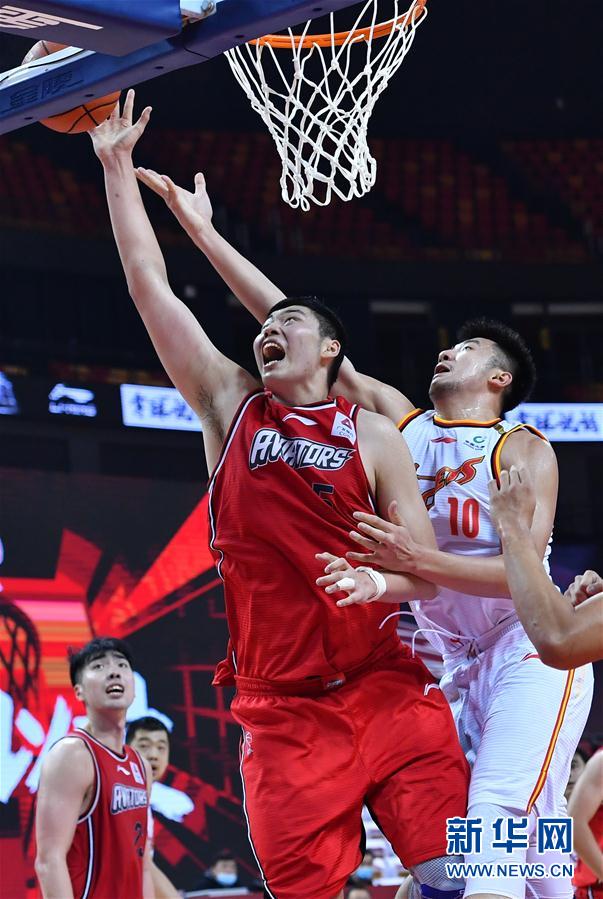 7月24日,八一南昌队球员邹雨宸(右)在比赛中拼抢篮板球。 当日,在山东青岛举行的2019-2020赛季中国男子篮球职业联赛(CBA)复赛第二阶段(红岛赛区)比赛中,八一南昌队以106比91战胜深圳马可波罗队。 新华社记者 朱峥 摄