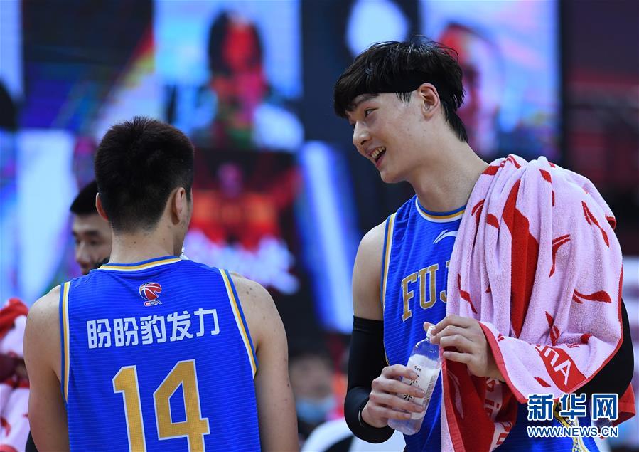 7月24日,福建豹发力队球员王哲林(右)在场边与队友交流。 当日,在山东青岛举行的2019-2020赛季中国男子篮球职业联赛(CBA)复赛第二阶段(红岛赛区)比赛中,福建豹发力队以127比120战胜上海久事队。 新华社记者朱峥摄