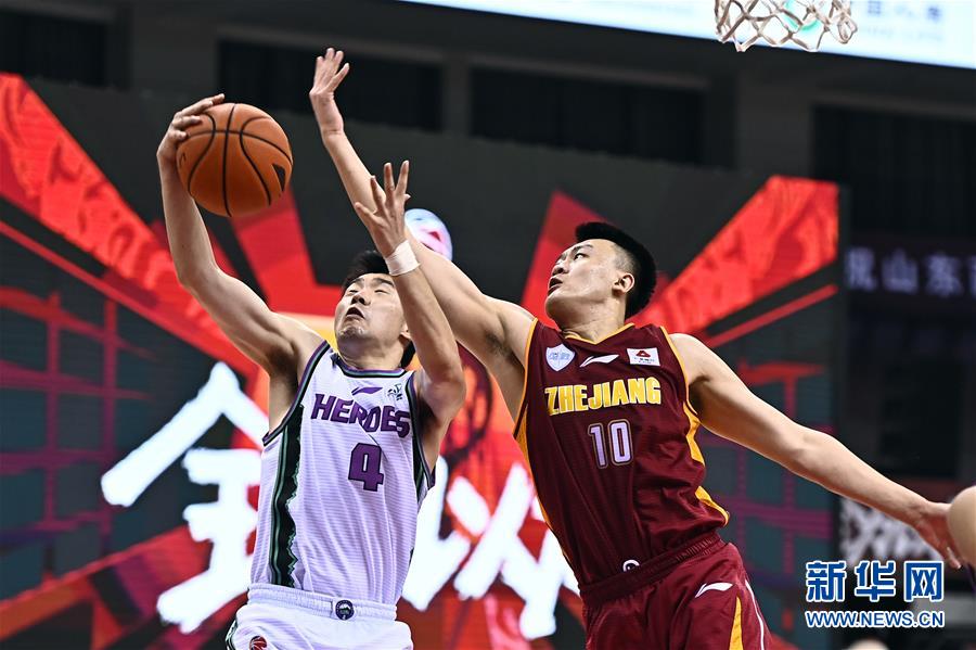 7月24日,浙江稠州银行队球员刘泽一(右)在比赛中防守山东西王队球员张辉。 当日,在山东青岛举行的2019-2020赛季中国男子篮球职业联赛(CBA)复赛第二阶段(崂山赛区)比赛中,浙江稠州银行队以102比88战胜山东西王队。 新华社记者郭绪雷摄