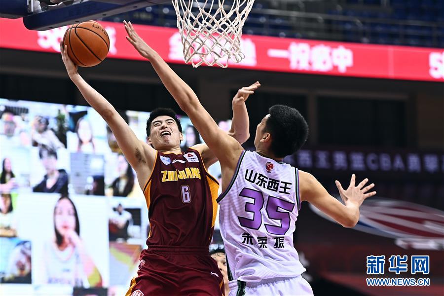 7月24日,浙江稠州银行队球员程帅澎(左)在比赛中上篮。 当日,在山东青岛举行的2019-2020赛季中国男子篮球职业联赛(CBA)复赛第二阶段(崂山赛区)比赛中,浙江稠州银行队以102比88战胜山东西王队。 新华社记者郭绪雷摄