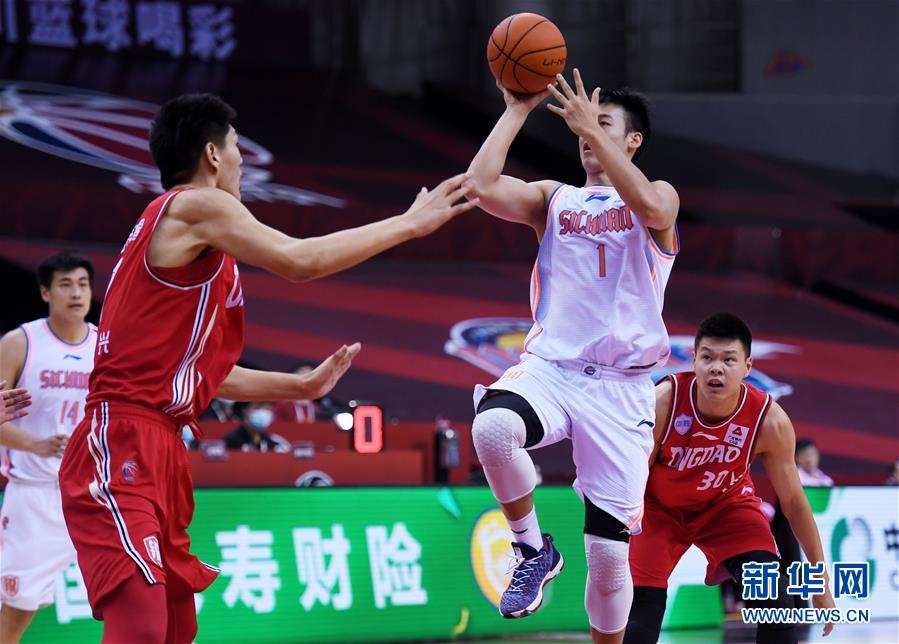 7月24日,四川五粮金樽队球员景菡一(右二)在比赛中进攻。 当日,在山东青岛举行的2019-2020赛季中国男子篮球职业联赛(CBA)复赛第二阶段(崂山赛区)比赛中,四川五粮金樽队迎战青岛国信双星队。 新华社记者李紫恒摄