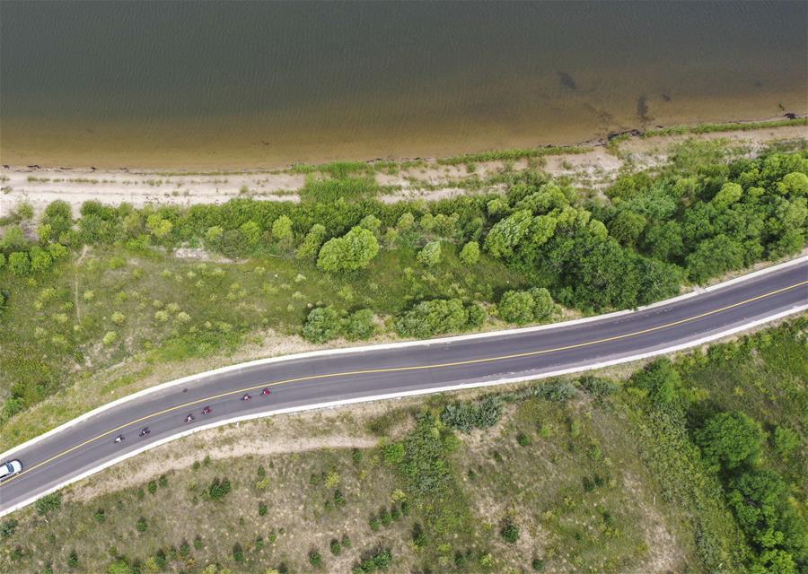 7月25日,参赛选手在比赛中(无人机拍摄)。 当日,第十四届环多伦湖公路自行车赛在内蒙古锡林郭勒盟多伦县举行。本届比赛分为男女精英组(91公里)和男女成人组(50公里),来自内蒙古自治区全区41支代表队的194名自行车运动员和运动爱好者参与其中。 新华社记者刘磊摄