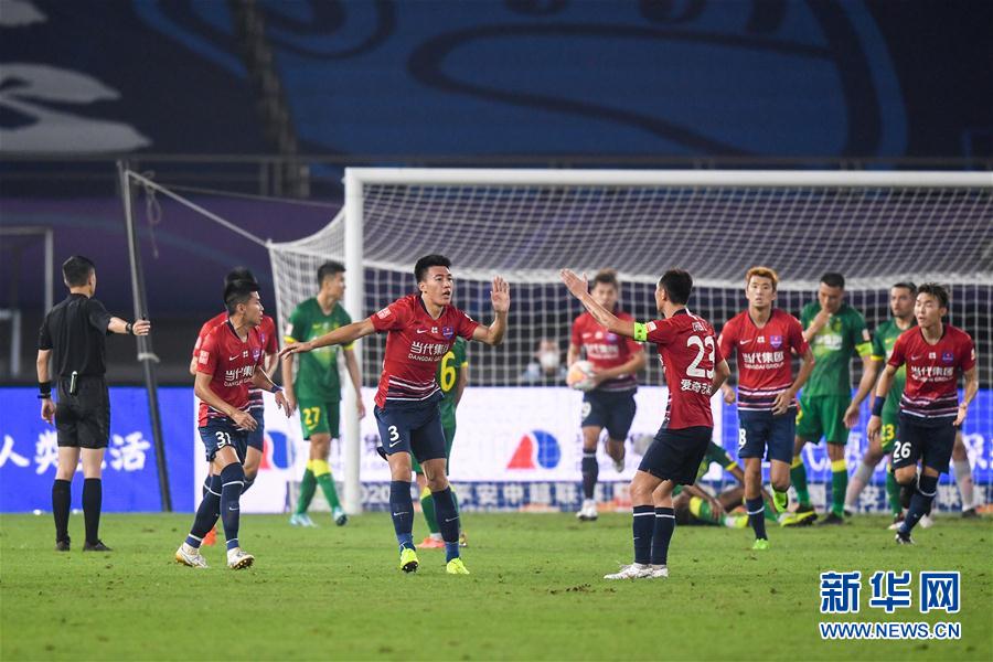 7月26日,重庆当代队球员杨帅(前左)在比赛中庆祝进球。 当日,在2020赛季中国足球协会超级联赛第一阶段(苏州赛区)第一轮比赛中,北京中赫国安队以2比1战胜重庆当代队。 新华社记者李博摄