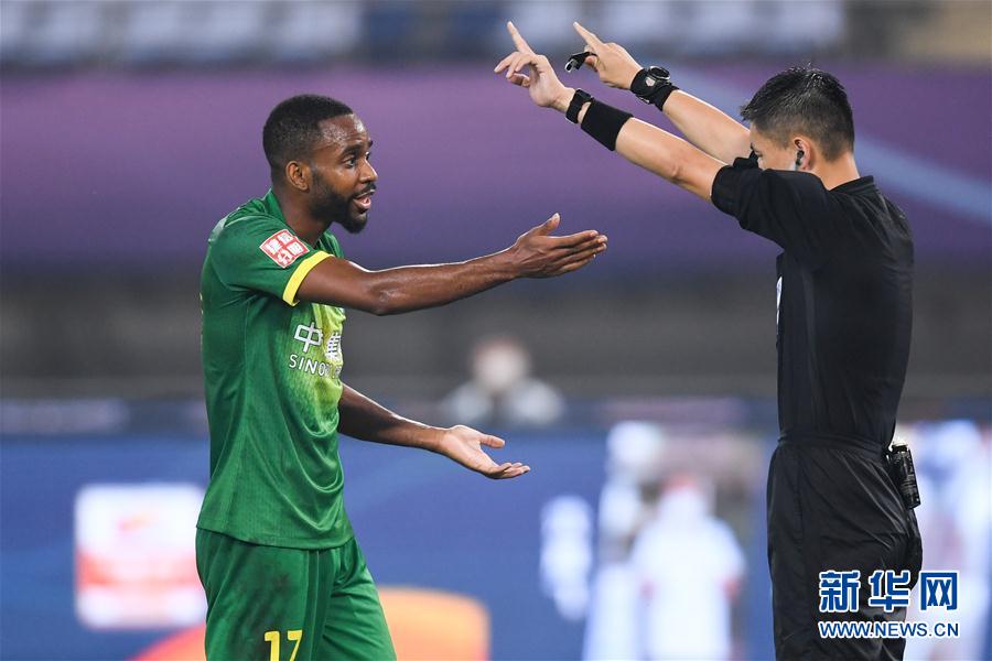 7月26日,北京中赫国安队球员巴坎布(左)在比赛中与裁判交涉。 当日,在2020赛季中国足球协会超级联赛第一阶段(苏州赛区)第一轮比赛中,北京中赫国安队以2比1战胜重庆当代队。 新华社记者李博摄