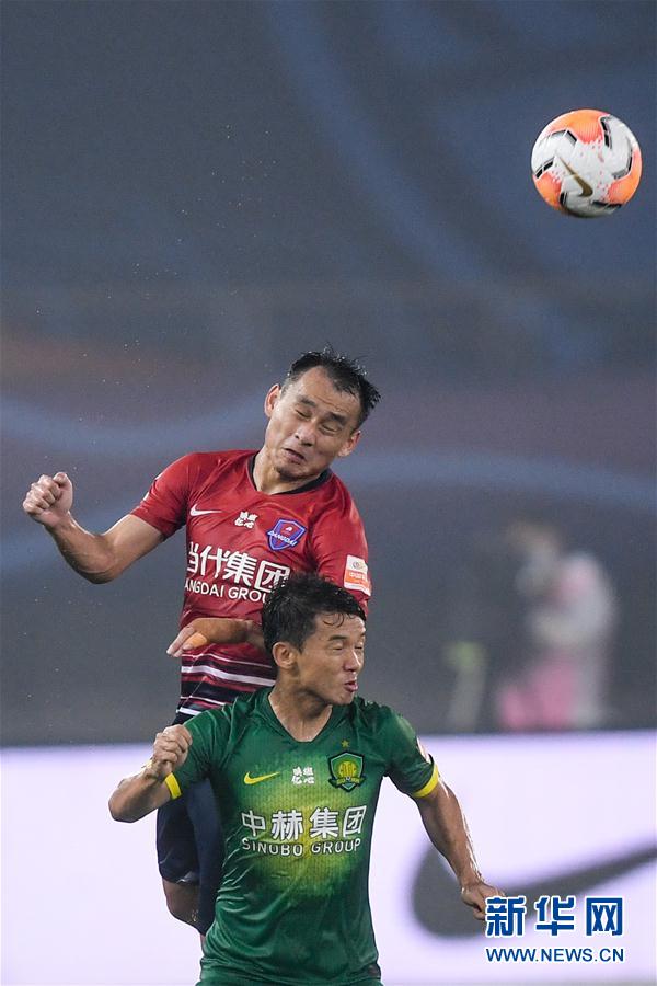 7月26日,重庆当代队球员陈杰(上)与北京中赫国安队球员池忠国拼抢。 当日,在2020赛季中国足球协会超级联赛第一阶段(苏州赛区)第一轮比赛中,北京中赫国安队以2比1战胜重庆当代队。 新华社记者李博摄