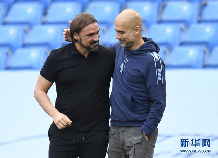 7月26日,曼城队主教练瓜迪奥拉(右)在赛后和诺维奇城队主教练法尔克致意。 当日,在2019-2020赛季英格兰足球超级联赛第38轮比赛中,曼城队主场以5比0战胜诺维奇城队。 新华社/路透