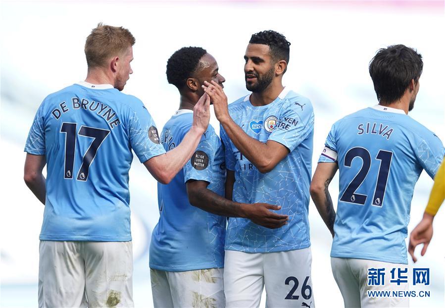 7月26日,曼城队球员马赫雷斯(右二)在进球后和队友斯特林(左二)、德布劳内(左一)庆祝。 当日,在2019-2020赛季英格兰足球超级联赛第38轮比赛中,曼城队主场以5比0战胜诺维奇城队。 新华社/路透