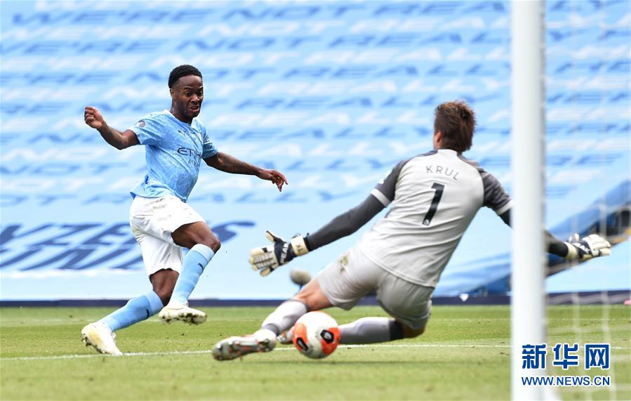 7月26日,曼城队球员斯特林(左)在比赛中射门得分。 当日,在2019-2020赛季英格兰足球超级联赛第38轮比赛中,曼城队主场以5比0战胜诺维奇城队。 新华社/路透
