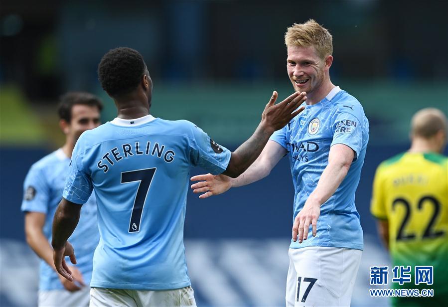 7月26日,曼城队球员德布劳内(右)在进球后和队友斯特林庆祝。 当日,在2019-2020赛季英格兰足球超级联赛第38轮比赛中,曼城队主场以5比0战胜诺维奇城队。 新华社/路透