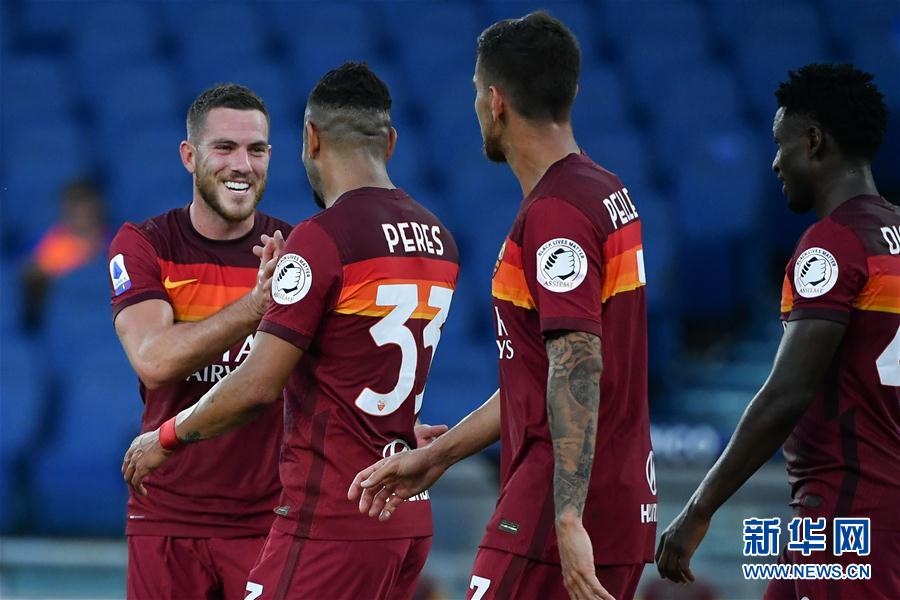 7月26日,罗马队球员韦勒图(左一)在进球后和队友庆祝。 当日,在2019-2020赛季意大利足球甲级联赛第36轮比赛中,罗马队主场以2比1战胜佛罗伦萨队。 新华社/法新
