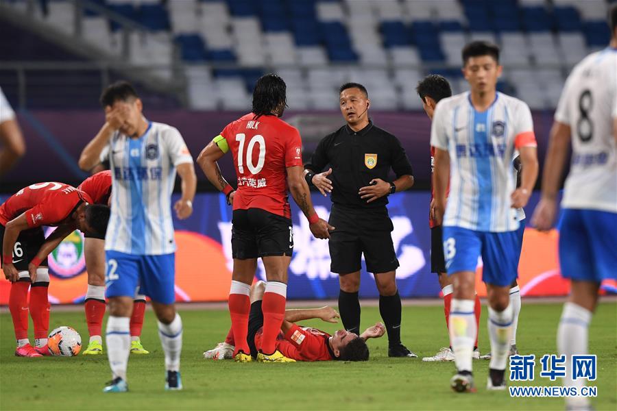 7月27日,主裁判石祯禄(中)在比赛中判罚。 当日,在2020赛季中国足球协会超级联赛第一阶段(苏州赛区)第一轮比赛中,上海上港队对阵天津泰达队。 新华社记者 李博 摄