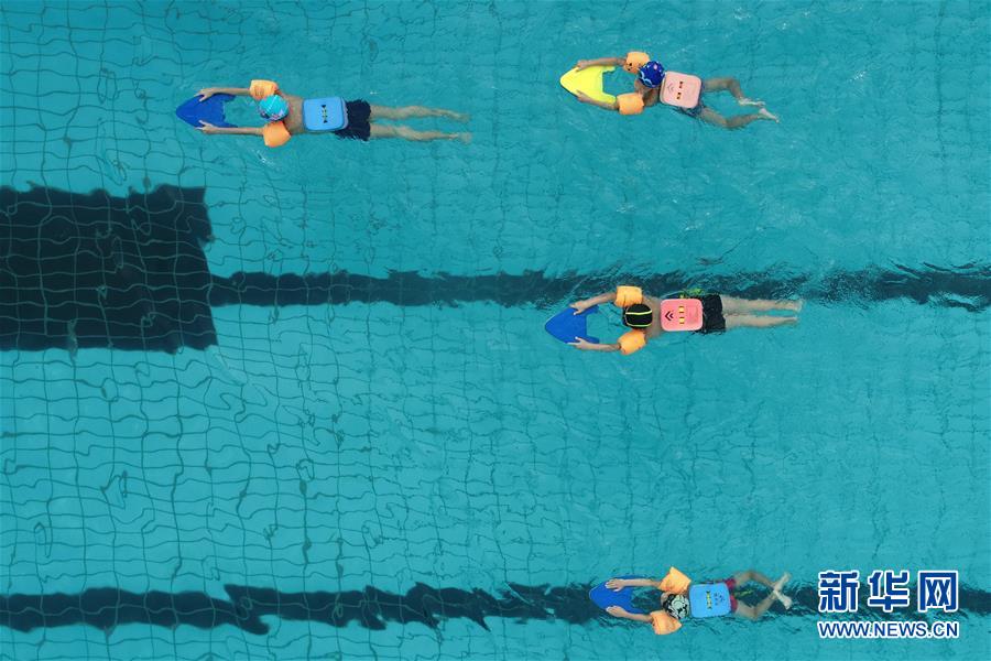 7月28日,孩子们在游泳池内练习游泳(无人机拍摄)。 在河北省沙河市,许多中小学生暑假期间来到游泳馆学习游泳,强身健体,清凉过夏日。 新华社记者 牟宇 摄