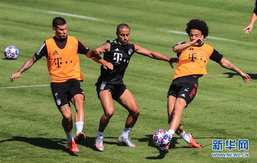 7月28日,拜仁慕尼黑队球员萨内、蒂亚戈与埃尔南德斯(从右至左)在训练中拼抢。 近日,拜仁慕尼黑队在德国慕尼黑恢复球队合练,备战当地时间8月8日与英超切尔西队的欧洲足球冠军联赛八分之一决赛次回合比赛。 新华社发(菲利普·鲁伊兹摄)