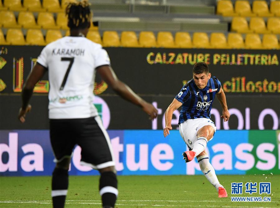 7月28日,亚特兰大队球员马利诺夫斯基(右)在比赛中射门得分。 当日,在2019-2020赛季意大利足球甲级联赛第37轮比赛中,亚特兰大队客场以2比1战胜帕尔马队。 新华社发