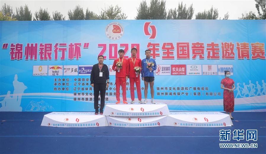 7月29日,男子20公里竞走冠军广东队选手王凯华(中)、亚军云南队选手张俊(左二)和季军山东队选手曾庆存(右二)在颁奖仪式上合影。 当日,2020年全国竞走邀请赛在辽宁省锦州市举行。本次比赛是疫情防控常态化条件下,国内举行的首批全国性赛事之一,同时也是田径项目复赛的“首秀”。比赛分为男子20公里竞走、男子35公里竞走和女子20公里竞走三个项目。在上午的比赛中,广东队选手王凯华以1小时19分46秒获得男子20公里竞走冠军,山东队选手孙松以2小时34分28秒获得男子35公里竞走冠军。 新华社记者 杨青 摄