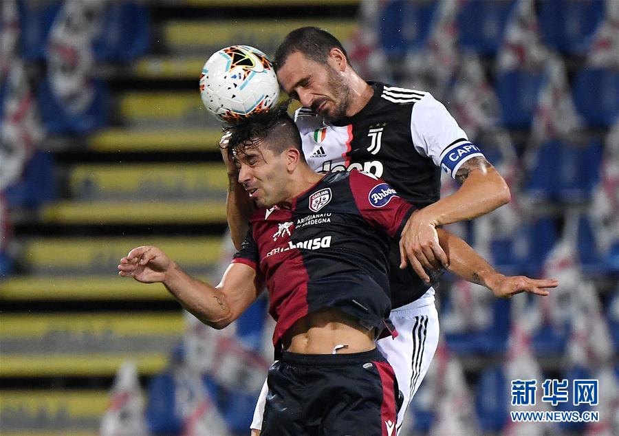 7月29日,尤文图斯队球员博努奇(上)和卡利亚里队球员乔瓦尼·西蒙尼在比赛中争顶。 当日,在2019-2020赛季意大利足球甲级联赛第37轮比赛中,尤文图斯队客场以0比2不敌卡利亚里队。 新华社/路透