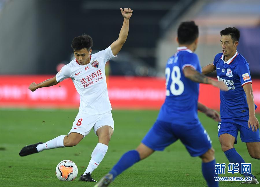 7月30日,深圳佳兆业队球员戴伟浚(左)在比赛中起脚。 当日,在2020赛季中国足球协会超级联赛第一阶段(大连赛区)第二轮比赛中,深圳佳兆业队以2比3不敌上海绿地申花队。 新华社记者 龙雷 摄