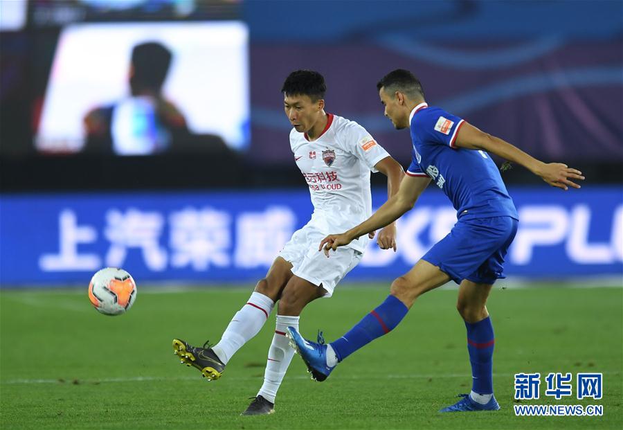 7月30日,深圳佳兆业队球员张远(左)在比赛中传球。 当日,在2020赛季中国足球协会超级联赛第一阶段(大连赛区)第二轮比赛中,深圳佳兆业队以2比3不敌上海绿地申花队。 新华社记者 龙雷 摄