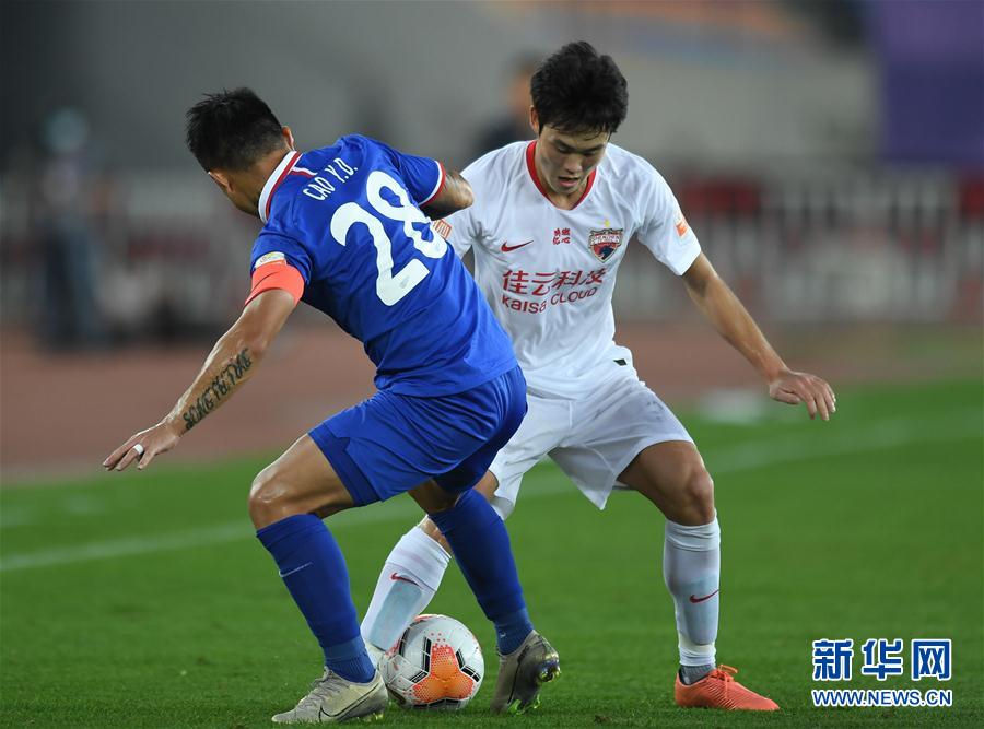 7月30日,深圳佳兆业队球员徐浩峰(右)在与上海绿地申花队球员曹赟定拼抢。 当日,在2020赛季中国足球协会超级联赛第一阶段(大连赛区)第二轮比赛中,深圳佳兆业队以2比3不敌上海绿地申花队。 新华社记者 龙雷 摄