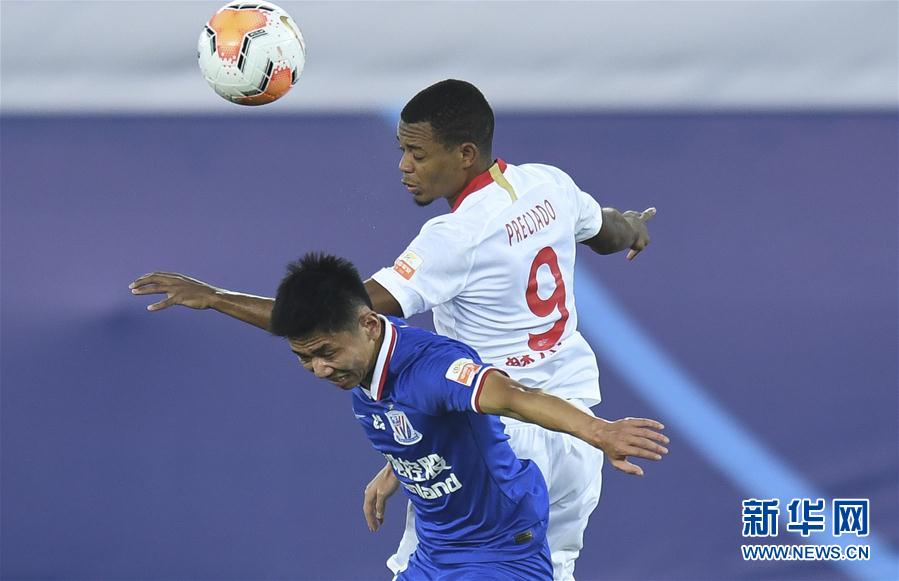 7月30日,深圳佳兆业队球员普雷西亚多(上)在比赛中争顶。 当日,在2020赛季中国足球协会超级联赛第一阶段(大连赛区)第二轮比赛中,深圳佳兆业队以2比3不敌上海绿地申花队。 新华社记者 龙雷 摄