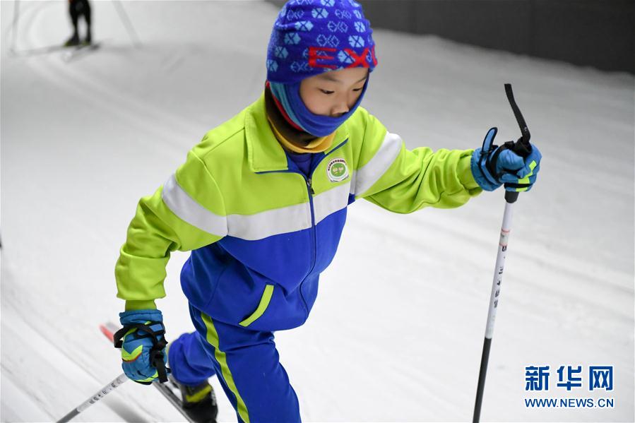 三伏天里,一群穿着滑雪服的孩子,走到一扇金属门前,摁下绿色按钮,门缓缓打开,一座超级大“冰箱”映入眼帘,孩子们鱼贯而入,顺坡滑远……这里就是吉林北山四季越野滑雪场,是亚洲首座具有国际水平的全天候标准化滑雪专业训练场地,它有效缓解了运动员在越野滑雪、冬季两项等运动项目训练的季节性限制,这里不仅是专业运动员的训练基地,也面向社会开放。 这群10至12岁的孩子们,他们来自吉林市多所小学,是吉林市越野滑雪青少年兴趣班成员。在炎热的暑假,他们不仅在室外的坡地上练习越野滑雪滑轮项目,每次还要在零下6摄氏度到零下10摄氏度的环境里练习越野滑雪2个多小时。 与高山滑雪不同,越野滑雪一圈一圈地循环往复,孩子们在滑雪场里训练非常辛苦,虽然经常跌倒,却从不喊累。 “我觉得我们现在特别幸福,夏天也可以滑雪,所以再辛苦也要坚持住。”越野滑雪青少年兴趣班成员明亦诺说。 吉林市越野滑雪青少年兴趣班成员辛梓源在吉林北山四季越野滑雪场里练习越野滑雪(7月27日摄)。 新华社发(颜麟蕴摄)