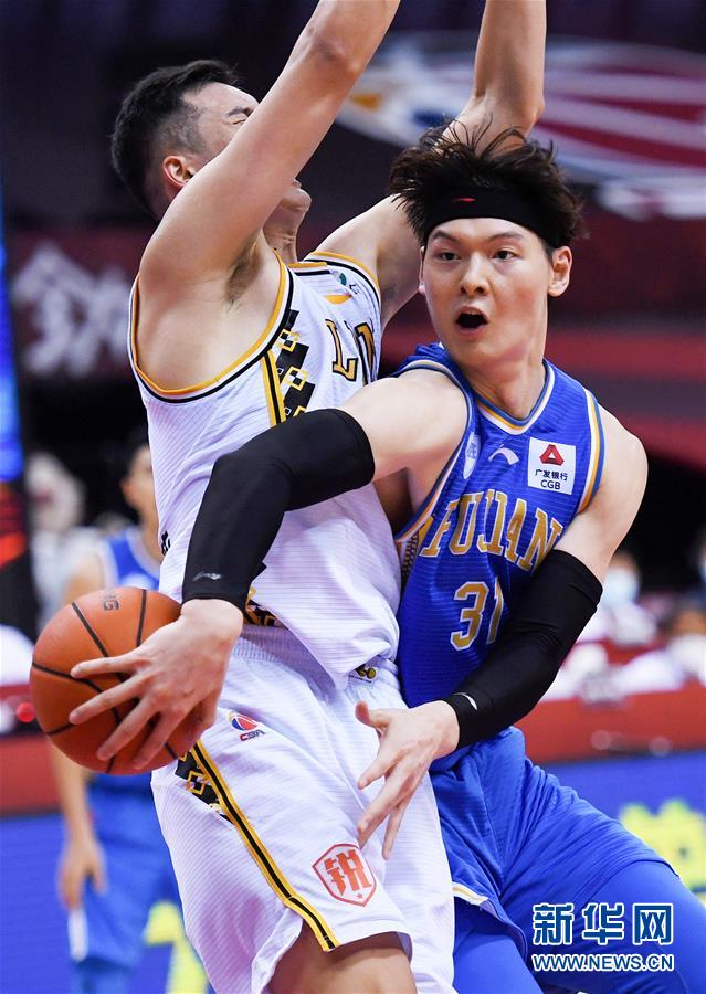 7月31日,福建豹发力队球员王哲林(右)在比赛中传球。 当日,在山东青岛举行的2019-2020赛季中国男子篮球职业联赛(CBA)季后赛首轮比赛中,福建豹发力队以132比119战胜浙江广厦控股队,晋级八强。 新华社记者李紫恒摄