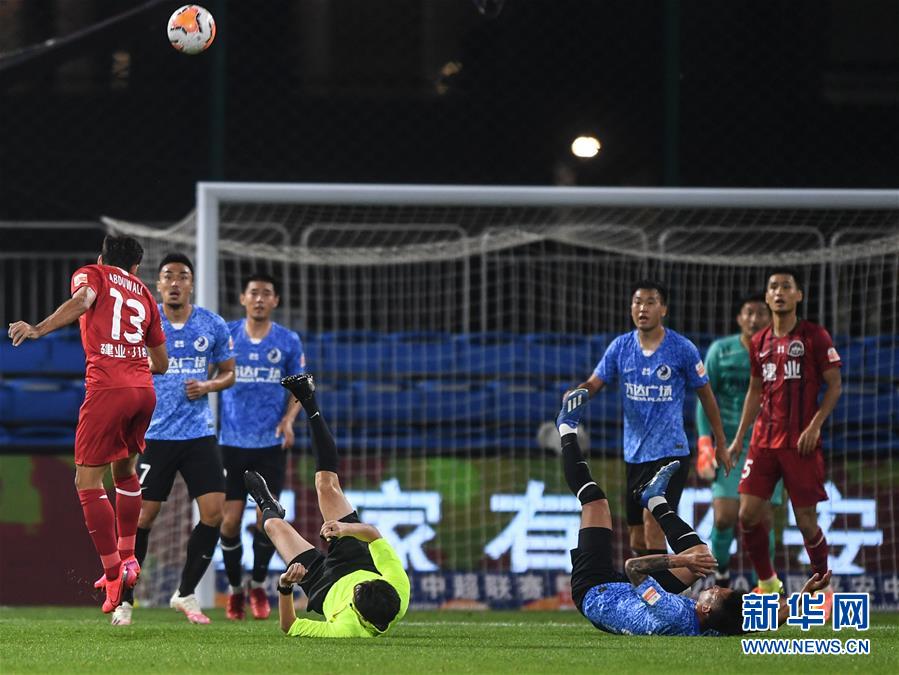 7月31日,主裁判艾堃(下左)在比赛中与大连人队球员孙铂(下右)相撞倒地。 当日,在2020赛季中国足球协会超级联赛第一阶段(大连赛区)第二轮比赛中,大连人队以1比1战平河南建业队。 新华社记者 潘昱龙 摄