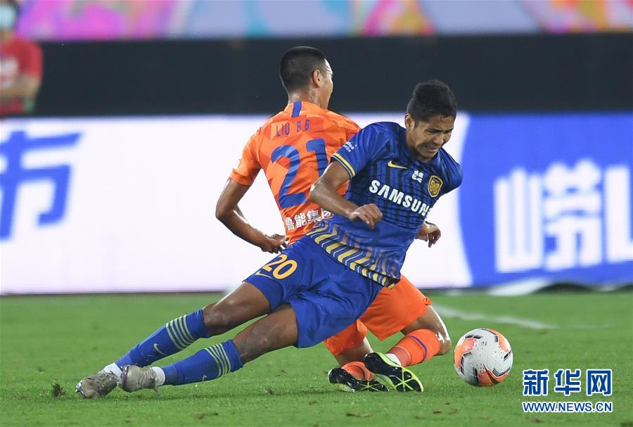 7月31日,江苏苏宁易购队球员阿不都海米提·阿不都格尼(前)与山东鲁能泰山队球员刘彬彬拼抢。 当日,在2020赛季中国足球协会超级联赛第一阶段(大连赛区)第二轮比赛中,江苏苏宁易购队以0比0战平山东鲁能泰山队。 新华社记者 龙雷 摄