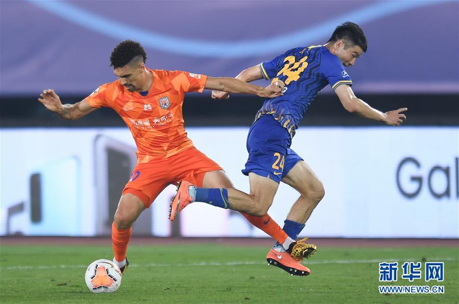 7月31日,江苏苏宁易购队球员吉翔(右)与山东鲁能泰山队球员莫伊塞斯在比赛中拼抢。 当日,在2020赛季中国足球协会超级联赛第一阶段(大连赛区)第二轮比赛中,江苏苏宁易购队以0比0战平山东鲁能泰山队。 新华社记者 龙雷 摄