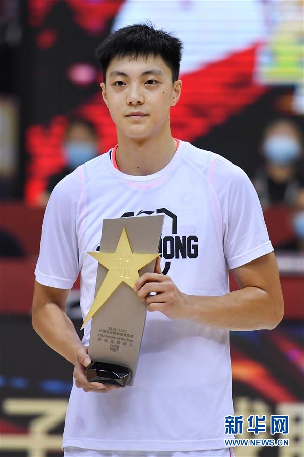 8月2日,年度最佳星锐球员胡明轩在赛前颁奖仪式上手捧奖杯。 当日,在2019-2020赛季中国男子篮球职业联赛(CBA)季后赛首场四分之一决赛前,广东东莞银行队球员易建联、胡明轩和主教练杜锋分别获颁CBA常规赛最有价值球员、年度最佳星锐球员和常规赛最佳教练员奖杯。 新华社记者 李紫恒 摄
