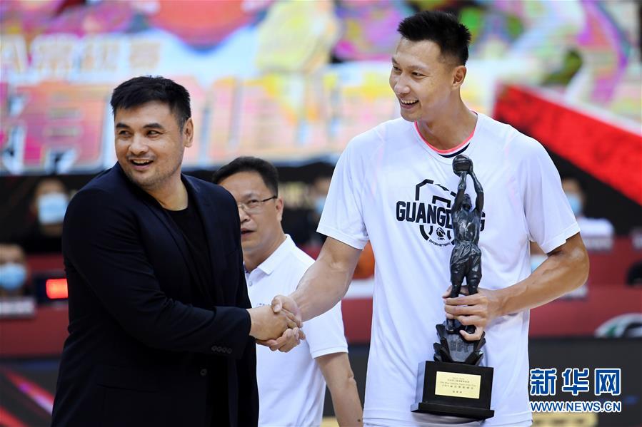 8月2日,刘玉栋(左)为CBA常规赛最有价值球员易建联(右)颁奖后与其握手致意。 当日,在2019-2020赛季中国男子篮球职业联赛(CBA)季后赛首场四分之一决赛前,广东东莞银行队球员易建联、胡明轩和主教练杜锋分别获颁CBA常规赛最有价值球员、年度最佳星锐球员和常规赛最佳教练员奖杯。 新华社记者 李紫恒 摄