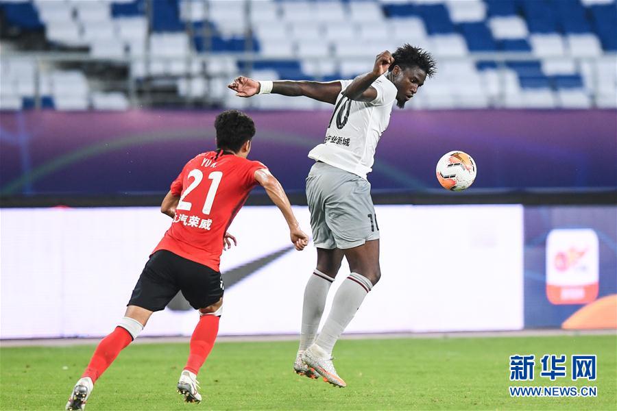 8月2日,河北华夏幸福队球员马尔考(右)与上海上港队球员于海在比赛中拼抢。 当日,在2020赛季中国足球协会超级联赛第一阶段(苏州赛区)第二轮比赛中,河北华夏幸福队以0比4不敌上海上港队。 新华社记者 李博 摄