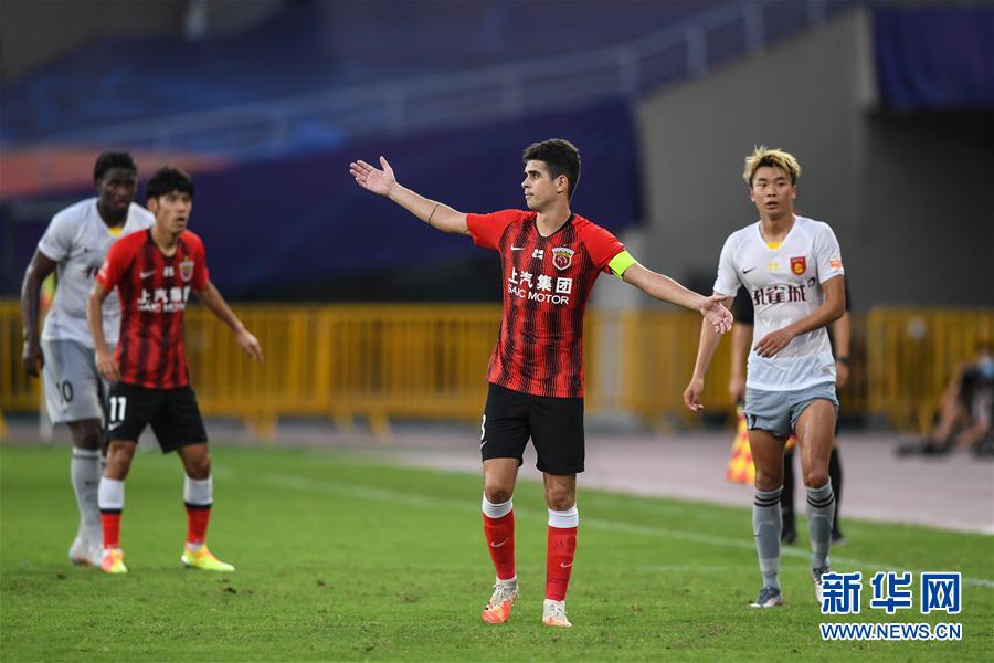 8月2日,上海上港队球员奥斯卡(右二)在比赛中。 当日,在2020赛季中国足球协会超级联赛第一阶段(苏州赛区)第二轮比赛中,上海上港队以4比0战胜河北华夏幸福队。 新华社记者 李博 摄