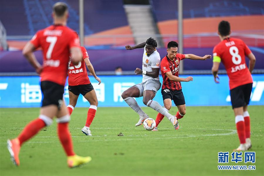 8月2日,上海上港队球员贺惯(右二)与河北华夏幸福队球员马尔考(右三)在比赛中争抢。 当日,在2020赛季中国足球协会超级联赛第一阶段(苏州赛区)第二轮比赛中,上海上港队以4比0战胜河北华夏幸福队。 新华社记者 李博 摄