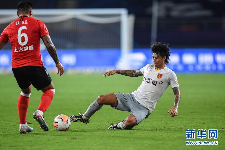 8月2日,河北华夏幸福队球员赵宇豪(右)在比赛中抢断上海上港队球员蔡慧康。 当日,在2020赛季中国足球协会超级联赛第一阶段(苏州赛区)第二轮比赛中,河北华夏幸福队以0比4不敌上海上港队。 新华社记者 李博 摄